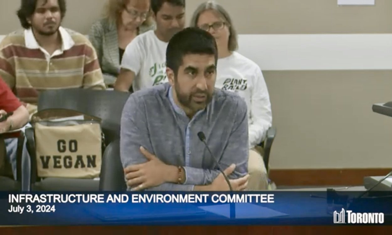 Toronto Vegetarian Food Bank was back at City Hall, speaking to a new climate-friendly food procurement policy report, based on a Motion that was adopted by City Council, after Veg Food Bank directors spoke at the Infrastructure and Environment Committee, in September 2023.