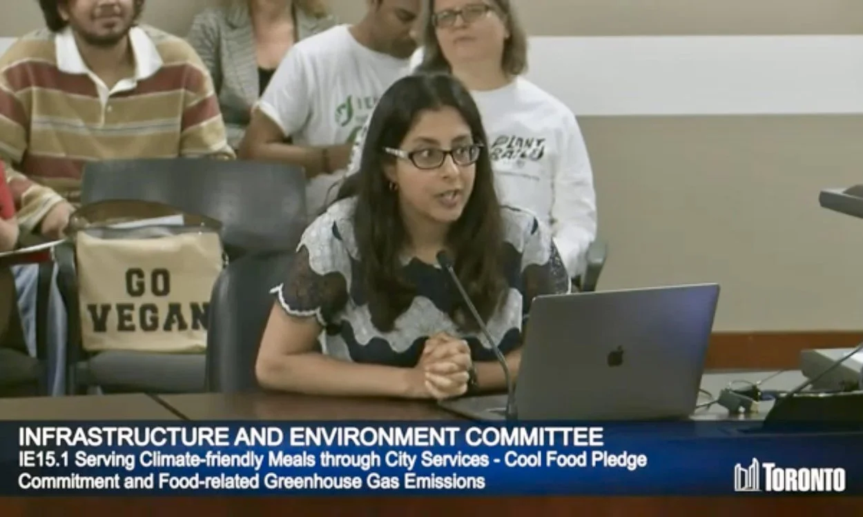 Following Nital's deputation, Riana Topan (Forward Food / Humane Society International Canada) spoke to the importance of replacing beef with plant-based foods (rather than with chicken and fish) to maximize the opportunity to reduce emissions, as well as pressure on land, water, and biodiversity, and for improving health, nutrition and animal welfare.