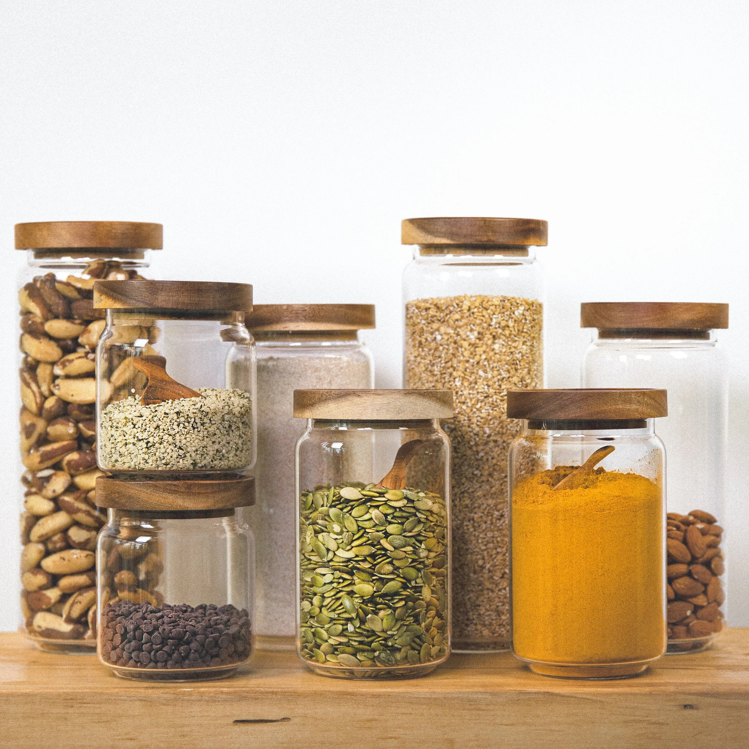 Refresh your pantry with our food-grade certified, stackable glass canisters- designed to help create easy, organized and beautiful storage. Hand-blown from Borosilicate glass [a high quality, durable and thermal shock resistant glass] and topped with a hand-made, natural + matte, acacia wood lid and silicone ring. These canisters are guaranteed to add warm and earthy tones to your pantry shelves. One dollar from every canister set supports Veg Food Bank.